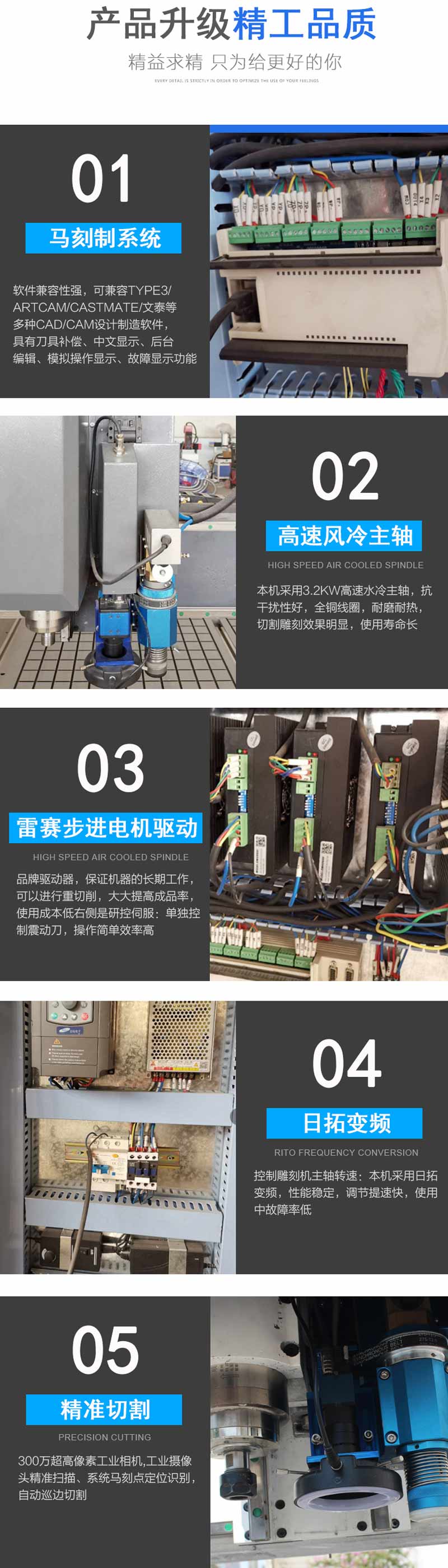 1. The front rotating shaft does not affect the working stroke of the platform, 2. Adopting adjustable clearance and replaceable rolling track square guide rails, with a service life of not less than 10 years and the best comprehensive performance 3. Adopting a box shaped cast iron platform to ensure high rigidity and precision 4. High efficiency machining of high-power spindle motors 5. Compatible with various software such as Type3/Artcam/Castmate/Pro/UG/Wentai. 6. It has functions such as power outage recovery, power outage continuation carving, processing time prediction, and truly humanized design. Suitable for woodworking, furniture, decoration industries, cylindrical object processing, such as cylindrical furniture accessories, pen barrels, stair handrails, cylindrical musical instruments, and other cylindrical handicrafts. Our professional sales and after-sales service team will promptly and efficiently solve your problems. National Unified Sales Hotline: 400-6587-688 Jinan Huawei CNC Equipment Co., Ltd Address: No. 18-1 Tonghua Road, Jinan City, Shandong Province Postal Code: 250000 Phone: 0531-88620266 Fax: 0531-88276988 Mobile phone: 15853195586 E-mail: cncmachine@jnhwcnc.com